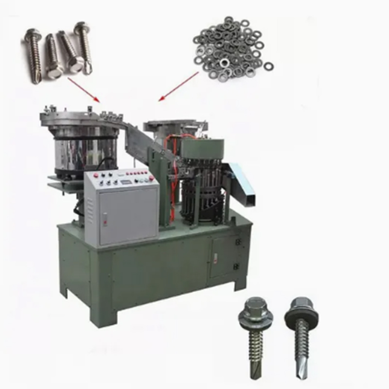 Машина для сборки винтовых шайб из углеродистой стали принимает винты и шайбы из отдельных бункеров. Он может автоматически достигать точного выравнивания между винтом и шайбой и стабильно прижимать шайбу в указанное положение винта. Это устройство специально разработано для работы с твердостью деталей из углеродистой стали и не изнашивается быстро.
